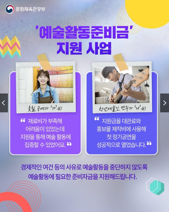 예술활동준비금 지원 사업은 경제적인 어려움을 겪는 예술인이 창작 활동을 지속할 수 있도록 지원하는 사업입니다.