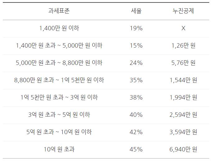 - 과세표준 및 세율에 대한 내용이 조금씩 다르게 개정되었는데요. 세율은 최소 6%부터 최대 45%까지 입니다.
