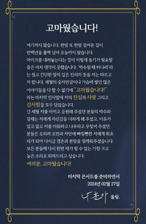 대한민국 가요계 큰 형님 나훈아님께서 올해 마지막 콘서트를 끝으로 은퇴를 하신다고 합니다. 이제는 더 이상 트로트의 황제 콘서트를 못 볼 예정이라 마지막 콘서트인 이번 전국투어 콘서트는 꼭! 예매 성공하셔야겠죠?! 예스24 화요일 오전 10시 티켓팅 오픈 및 예매 성공할 수 있는 꿀팁과 함께 상반기 콘서트 일정에 대해 안내드리겠습니다. (하반기 일정은 별도 안내)