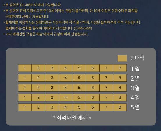 - 본 공연은 전석 지정석으로만 만 10세 이하는 관람이 불가하며, 만 10세 이상은 인원수대로 좌석을 구매하여야 관람이 가능합니다.