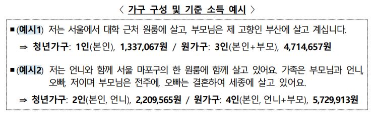 - (소득.재산요건) 청년 본인가구와 부모 등을 포함하는 원가구의 소득 및 재산을 고려