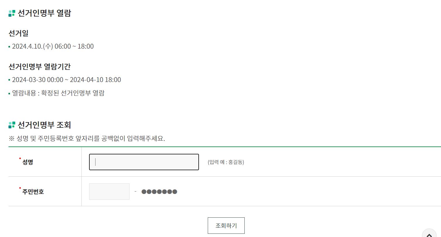 - 중앙선거관리위원회 선거시스템에 접속하여 오른쪽 투표소 찾기 연결서비스 클릭하여 거주 지역 선택 후 선거인명부 열람시스템 접속 -> 이름 및 주민등록번호 앞자리 입력 후 조회 -> 지정된 투표소 확인 가능