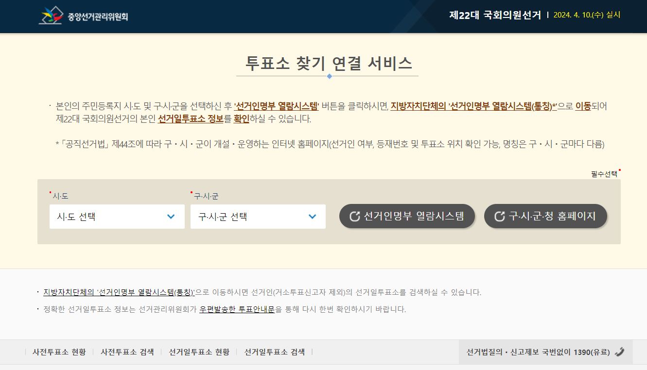 - 중앙선거관리위원회 선거통계시스템을 통해 내 지역에서 사전투표 가능한 장소를 검색할 수 있습니다.