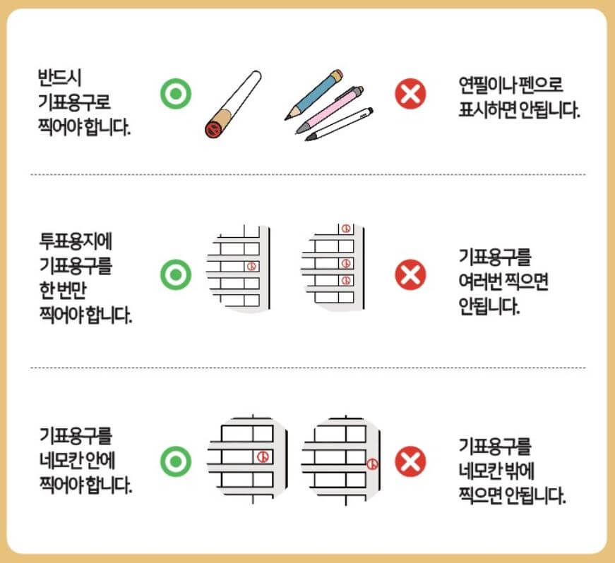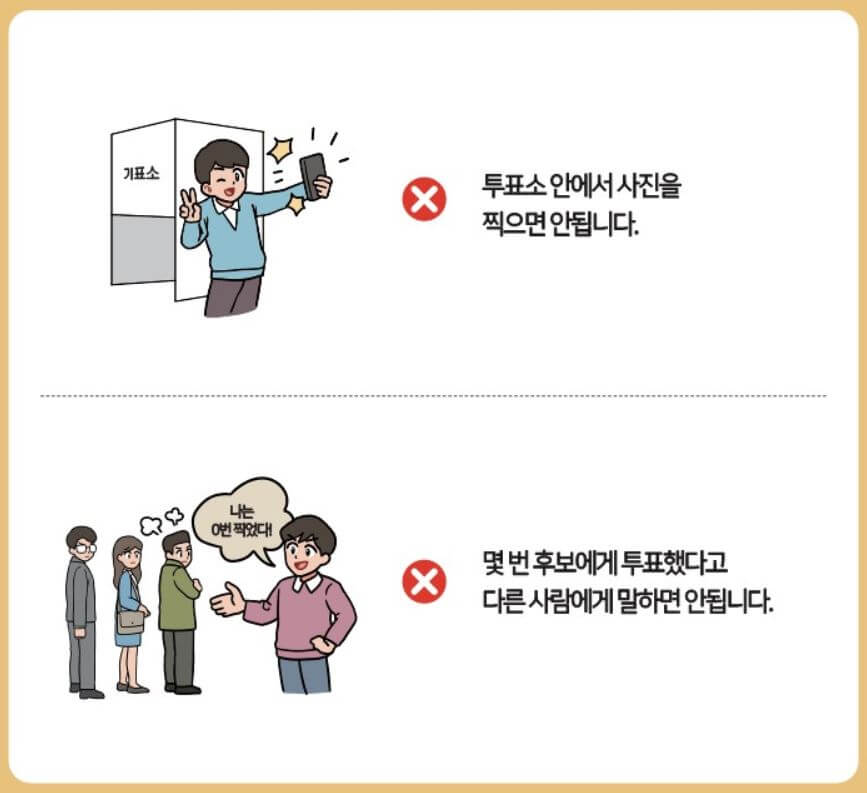 - 기표할 때 조심해야 할 것 투표소 안에서 사진을 찍으면 안됩니다.