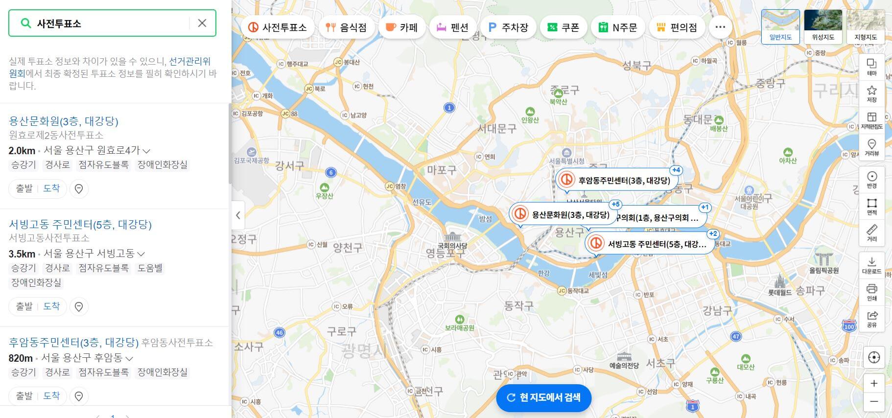 - 네이버 지도 & 카카오 지도내 사전투표소 검색시에도 사전투표 가능한 장소를 검색할 수 있으나 실제 정보와 차이가 있을 수 있으니 방문 전 다시 확인하거나 중앙선거관리위원회 홈페이지를 통해 정확하게 확인 후 방문하시는 것이 좋습니다.