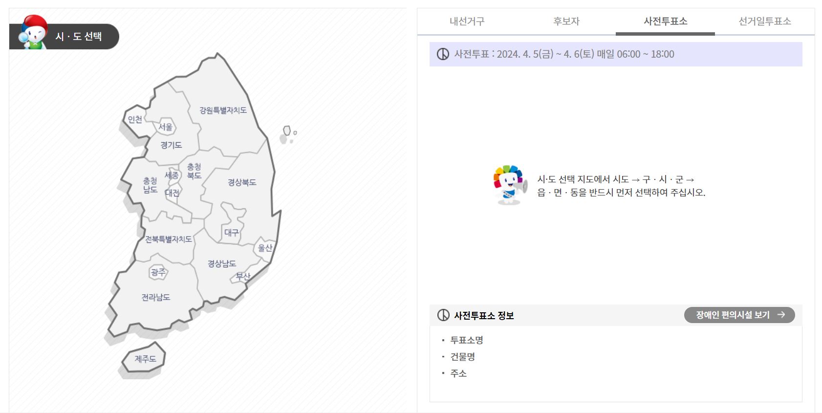 - 본 선거일은 2024년 4월 10일(수) 이며, 사전 투표와 동일하게 오전 6시 ~ 오후6시까지 투표가능