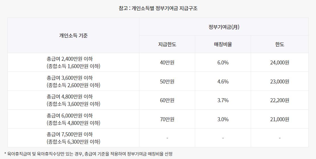 - 납입한 금액에 비례해 소득구간별 정부기여금 지원