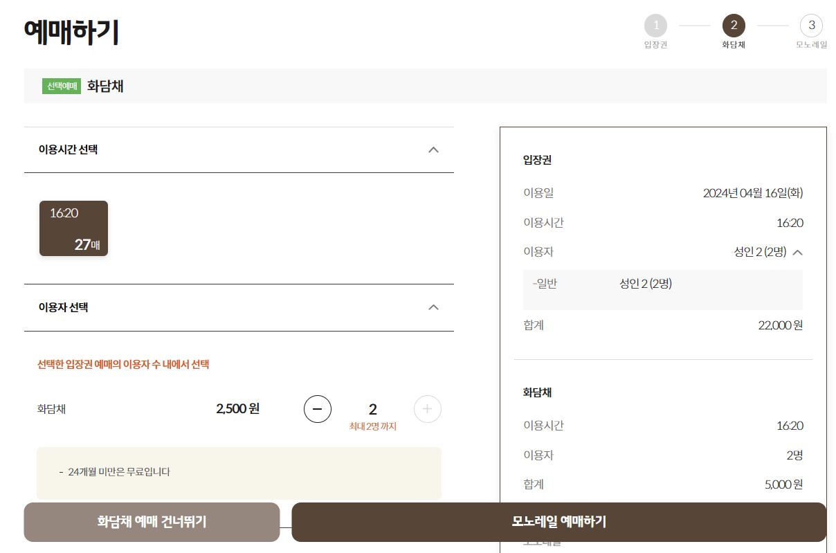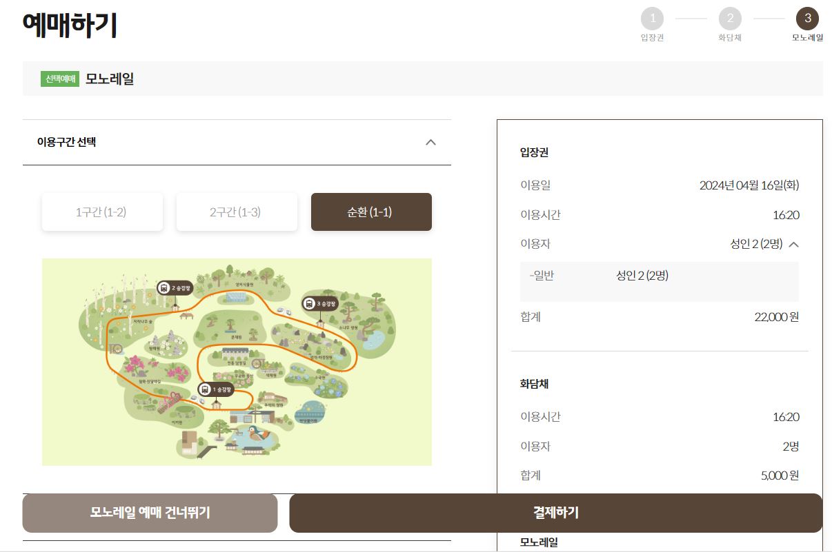 화담채까지 함께 이용하실 경우 해당 이용 시간 및 이용 인원을 선택하시고 모노레일 예매하기 버튼을 클릭하시면 됩니다. 마지막으로 모노레일 예매하는 화면에서 구간 선택 및 이용 인원을 선택하신 후 결제하기 버튼을 클릭하면 화담숲 입장권, 화담채, 모노레일까지 예매가 모두 완료됩니다.