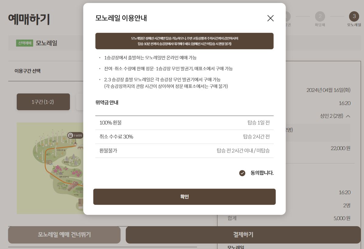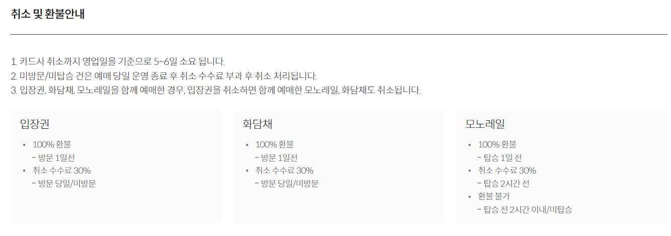 - 모노레일의 경우 탑승 1일 전까지 100% 환불이 가능하며, 탑승 2시간전까지는 취소 수수료 30% 제외후 환불 가능, 탑승 전 2시간 이내 또는 미탑승시에는 환불이 불가한 점 참고 바랍니다.