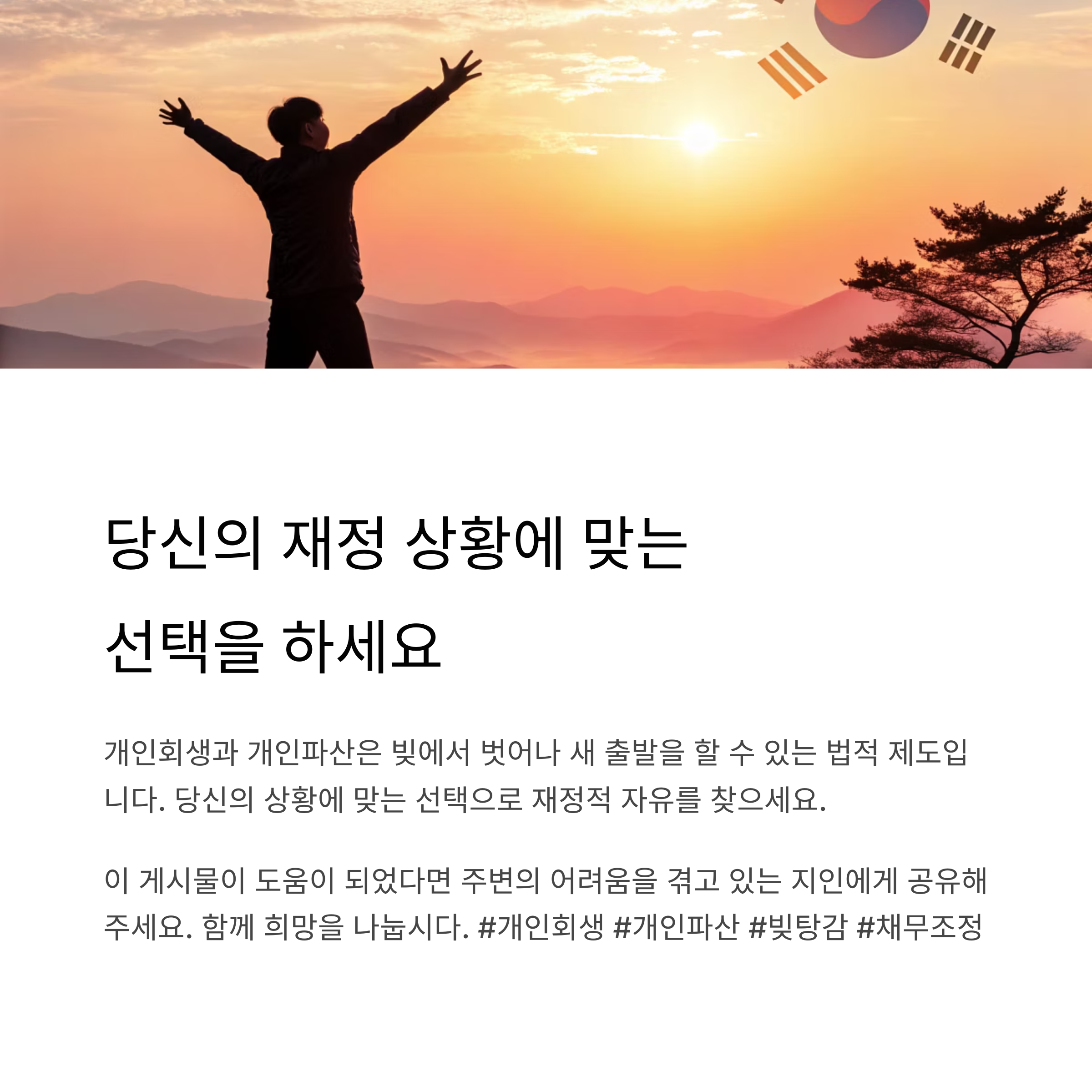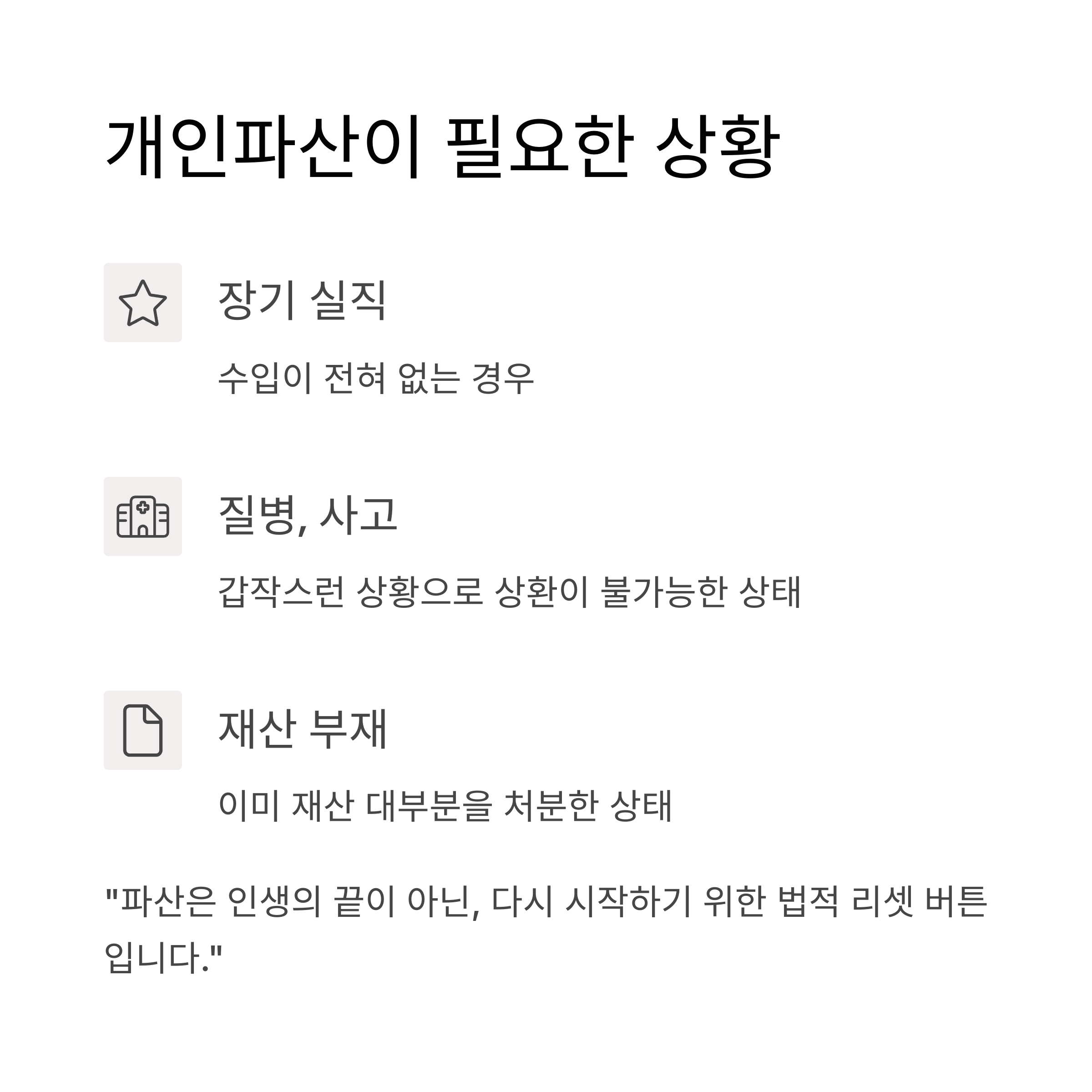 "파산은 인생의 끝이 아닌, 다시 시작하기 위한 법적 리셋 버튼입니다."