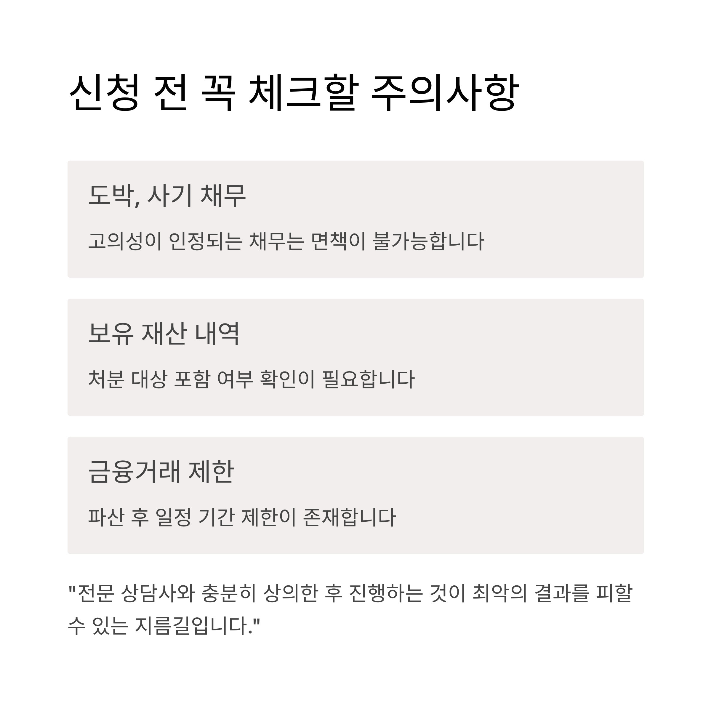 • A: 고의성이 인정되는 채무(도박, 사기 등)는 면책이 불가능합니다.