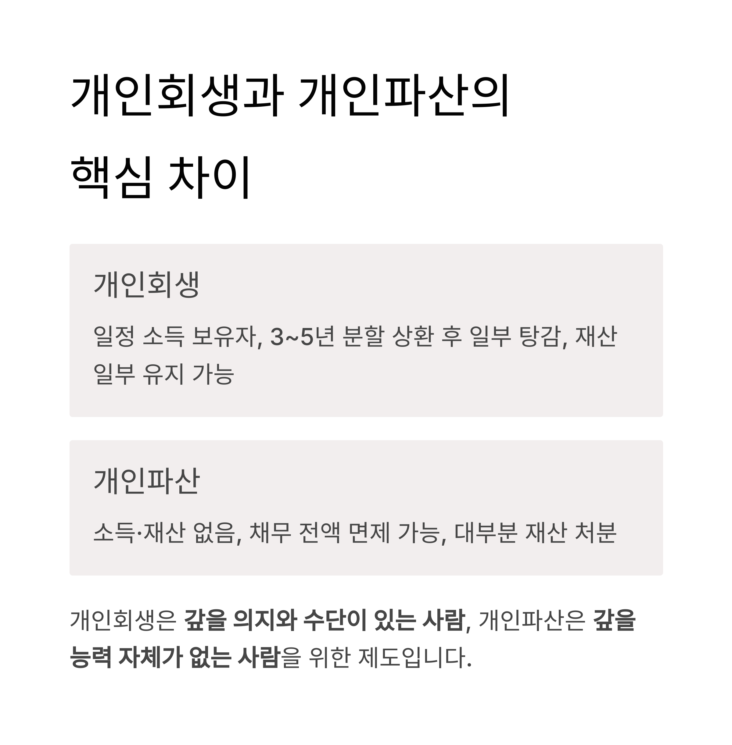 | 항목 | 개인회생 | 개인파산 |