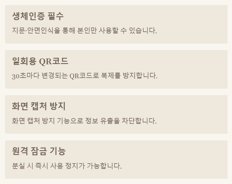✅ 생체인증 (지문·안면인식) 필수 → 타인 사용 불가능
