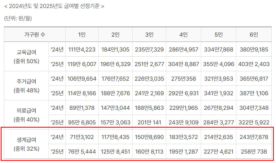 생계급여 대상자는 가구의 소득인정액기준 중위소득의 32% 이하여야 합니다. 2025년에는 기준 중위소득이 6.42% 인상되면서 지원 대상이 더 확대되었습니다.