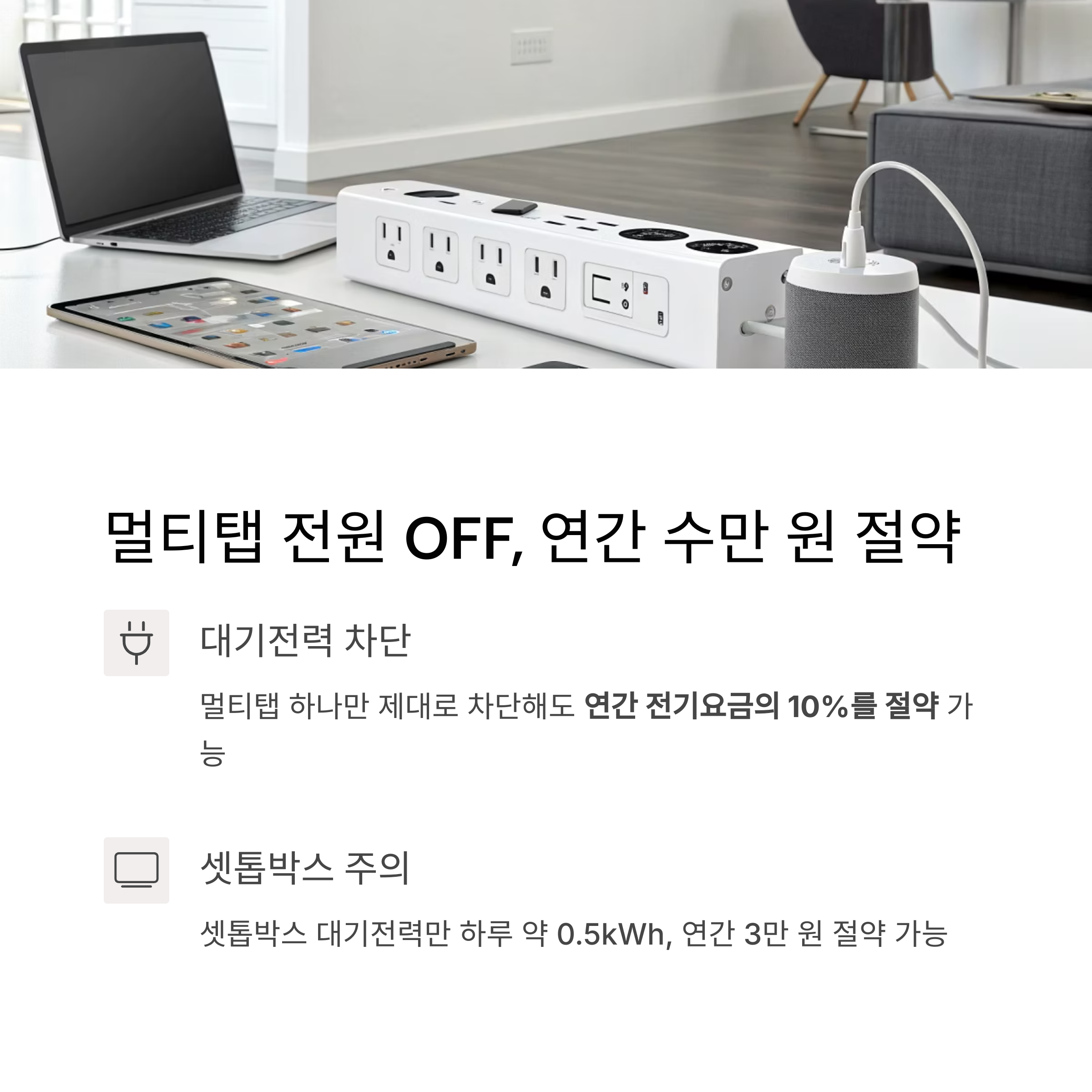 멀티탭 하나만 제대로 차단해도 연간 전기요금의 10%를 아낄 수 있습니다.