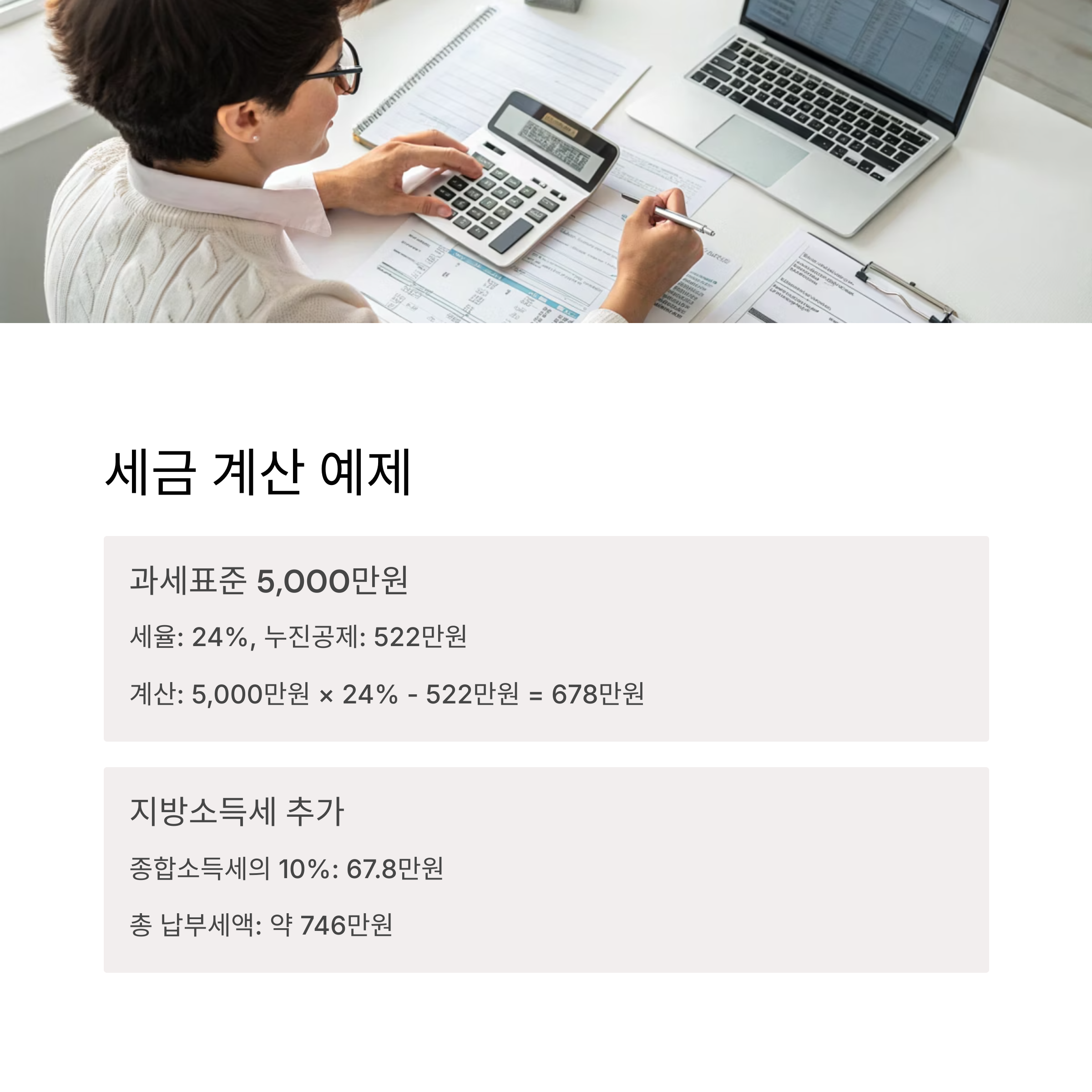 - 계산식: 5,000만 원 × 24% - 522만 원 = 678만 원