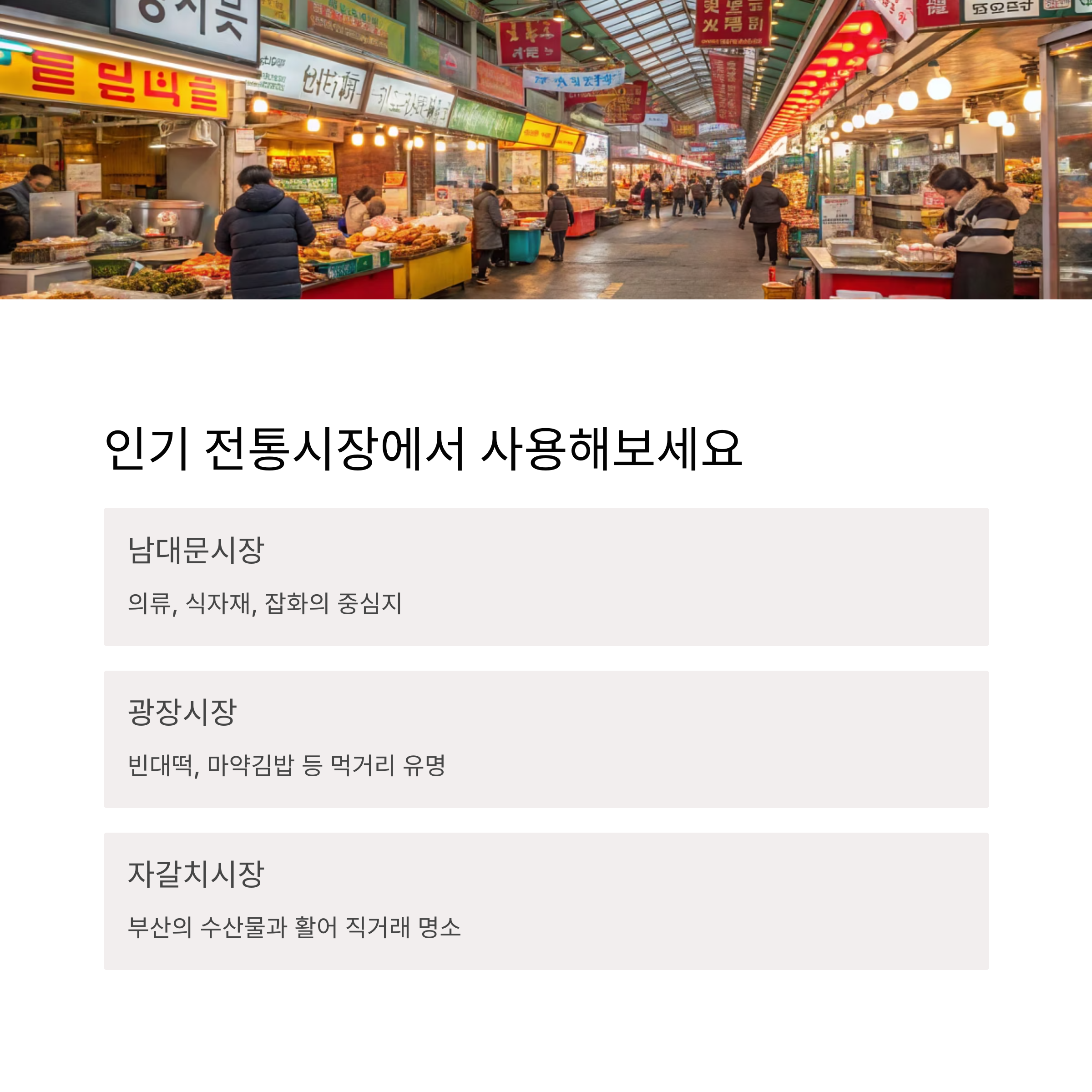 | 남대문시장 | 서울 | 의류, 식자재, 잡화의 중심지 |