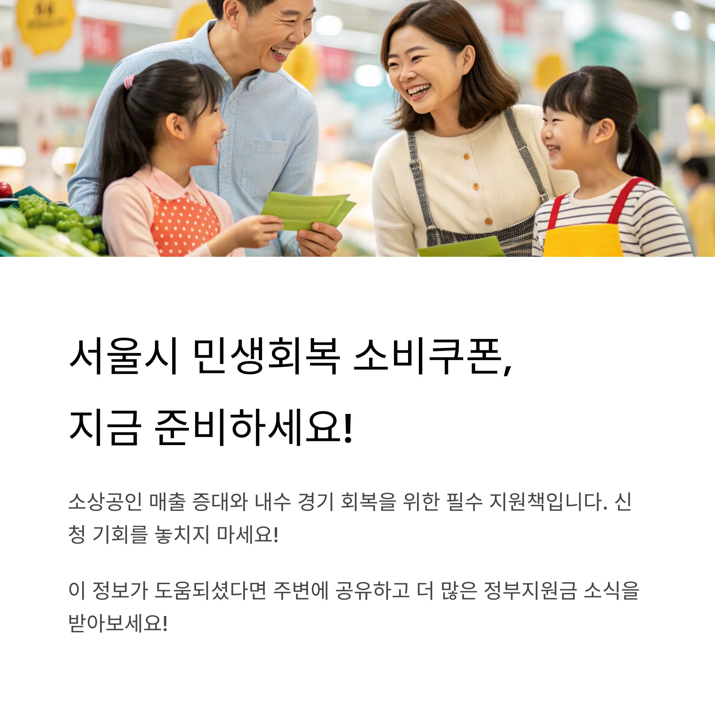서울시 민생회복 소비쿠폰은 소상공인 매출 증대와 내수 경기 회복을 위해 꼭 필요한 지원책입니다. 신청 기회를 놓치지 않도록 지금 바로 준비하시고, 사용 기한 내 알뜰하게 활용해 보세요!