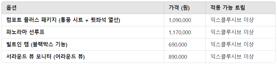 🔧 옵션: 파노라마 선루프 (1,170,000원) + 서라운드 뷰 모니터 (890,000원)