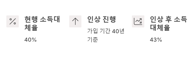 보험료율 인상에 맞춰 소득대체율도 40% → 43%로 상향됩니다. 이는 가입 기간 40년 기준이며, 실질적으로 받는 연금액이 늘어난다는 의미입니다.