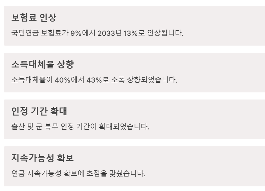연금 고갈 시점을 늦추고, 미래 세대 부담을 줄이기 위한 조치들이 포함되었습니다. 이는 결국 지금의 청년세대가 부담을 지면서도 일정 혜택을 받을 수 있도록 구조를 조정한 것입니다.