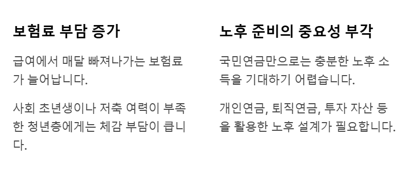 급여에서 매달 빠져나가는 보험료가 늘어나게 되며, 특히 사회 초년생이나 저축 여력이 부족한 청년층에게는 체감 부담이 클 수 있습니다. 연금 수령 시기인 수십 년 후를 생각하면 '투자'의 개념일 수도 있지만, 당장은 생활비를 줄이는 요인이 되죠.