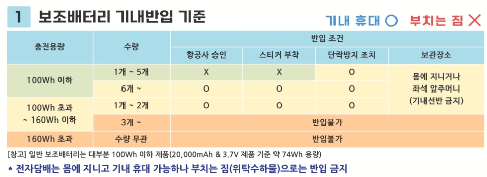✅ 보조배터리 기내 반입 가능 (100Wh 이하 최대 5개, 160Wh 이하 2개)