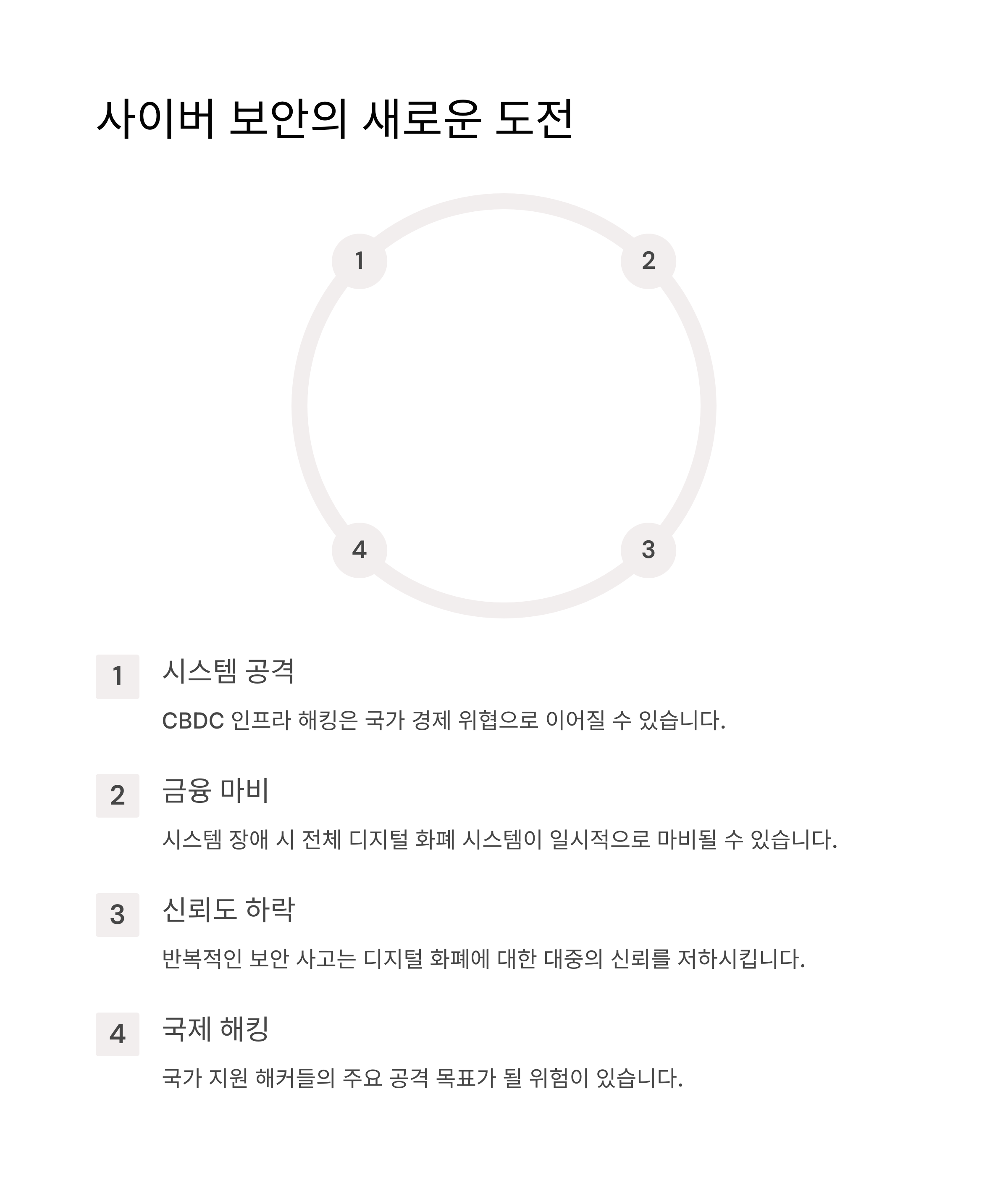 CBDC가 디지털 기반으로 운영되는 만큼, 해킹, 내부자 정보 유출, 데이터 오·남용 위험도 커집니다.