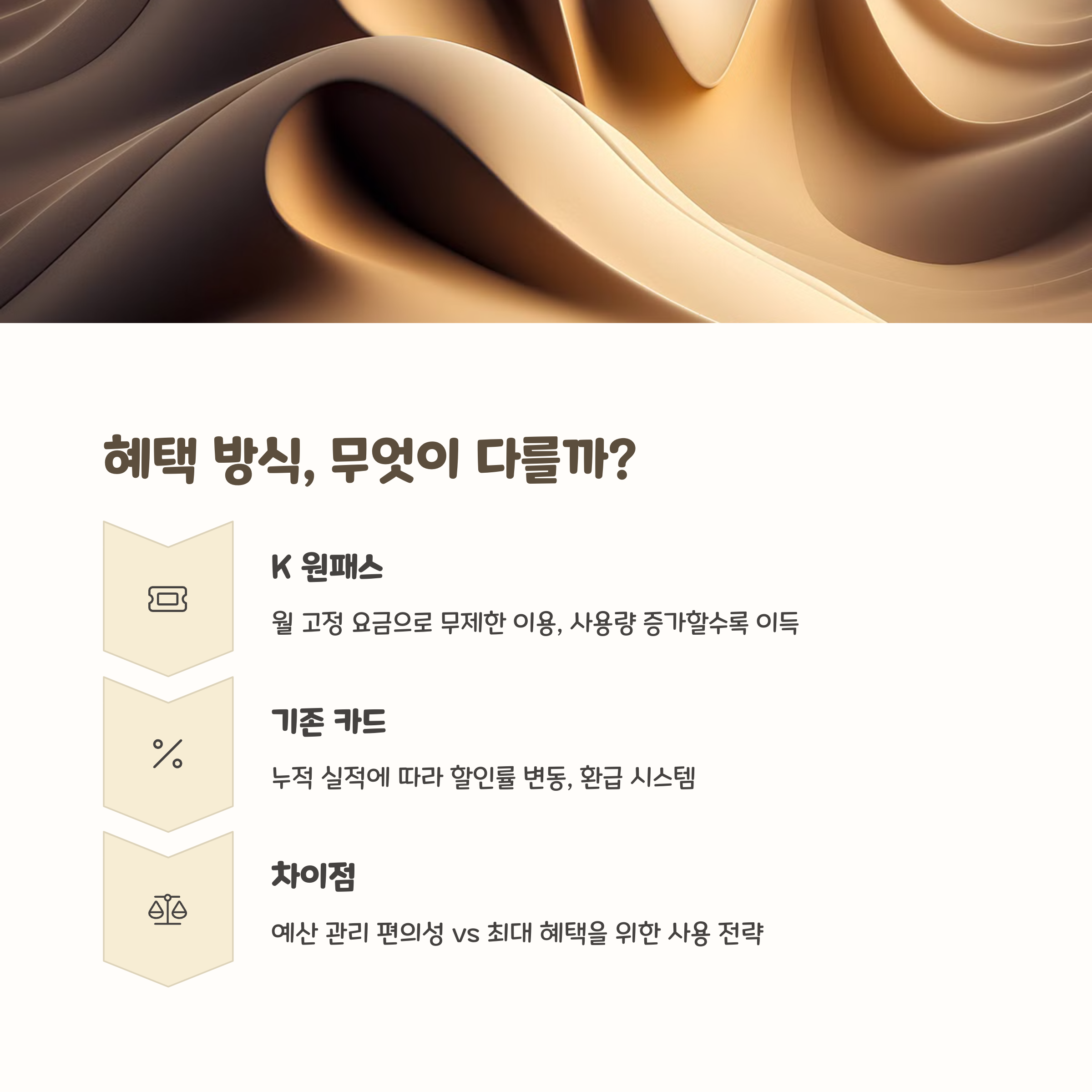 - 기존 교통카드/K-패스: 사용한 만큼 결제 ➔ 이용 실적에 따라 환급·할인
