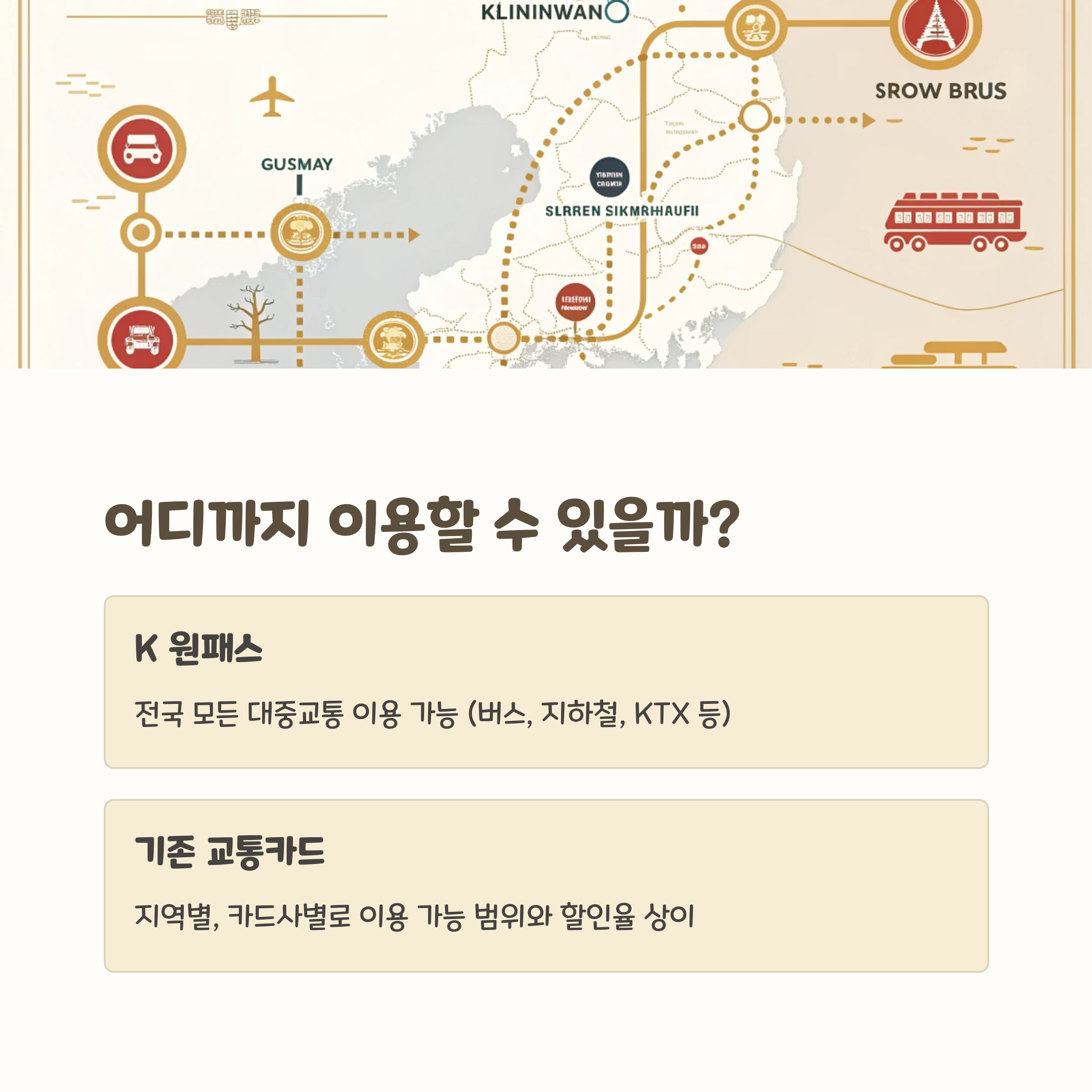 - 기존 교통카드/K-패스: 수도권 중심, 지역별 일부 적용 / 카드사에 따라 커버리지 다름