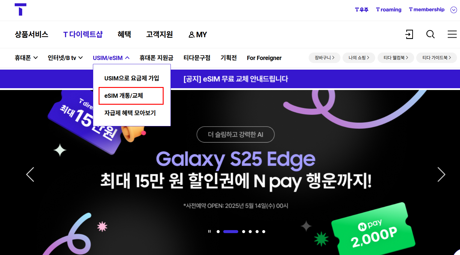 - 로그인 후, eSIM 셀프 개통 메뉴 선택