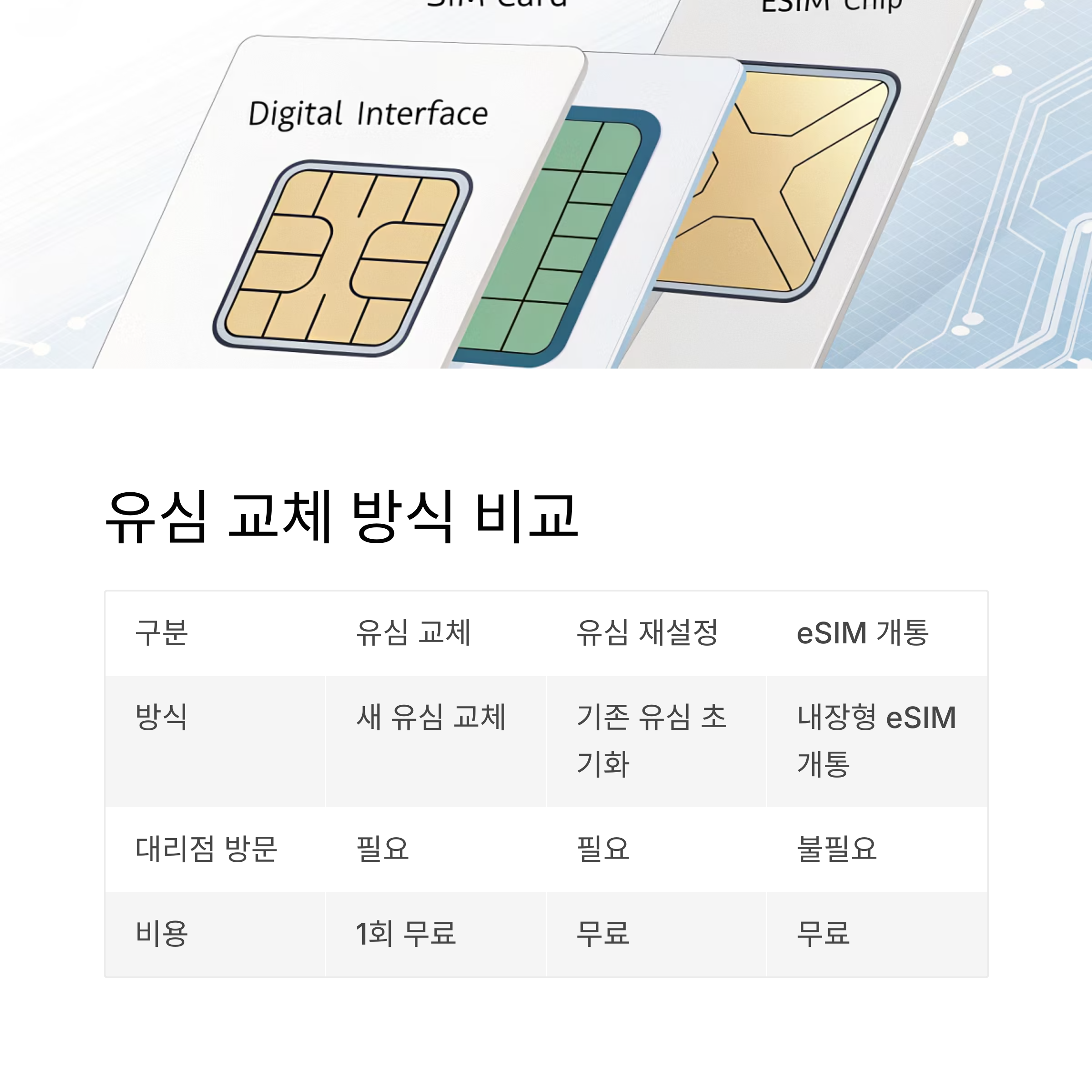 | 방식 | 새 유심 교체 | 기존 유심 정보 초기화 | 내장형 eSIM 개통 |