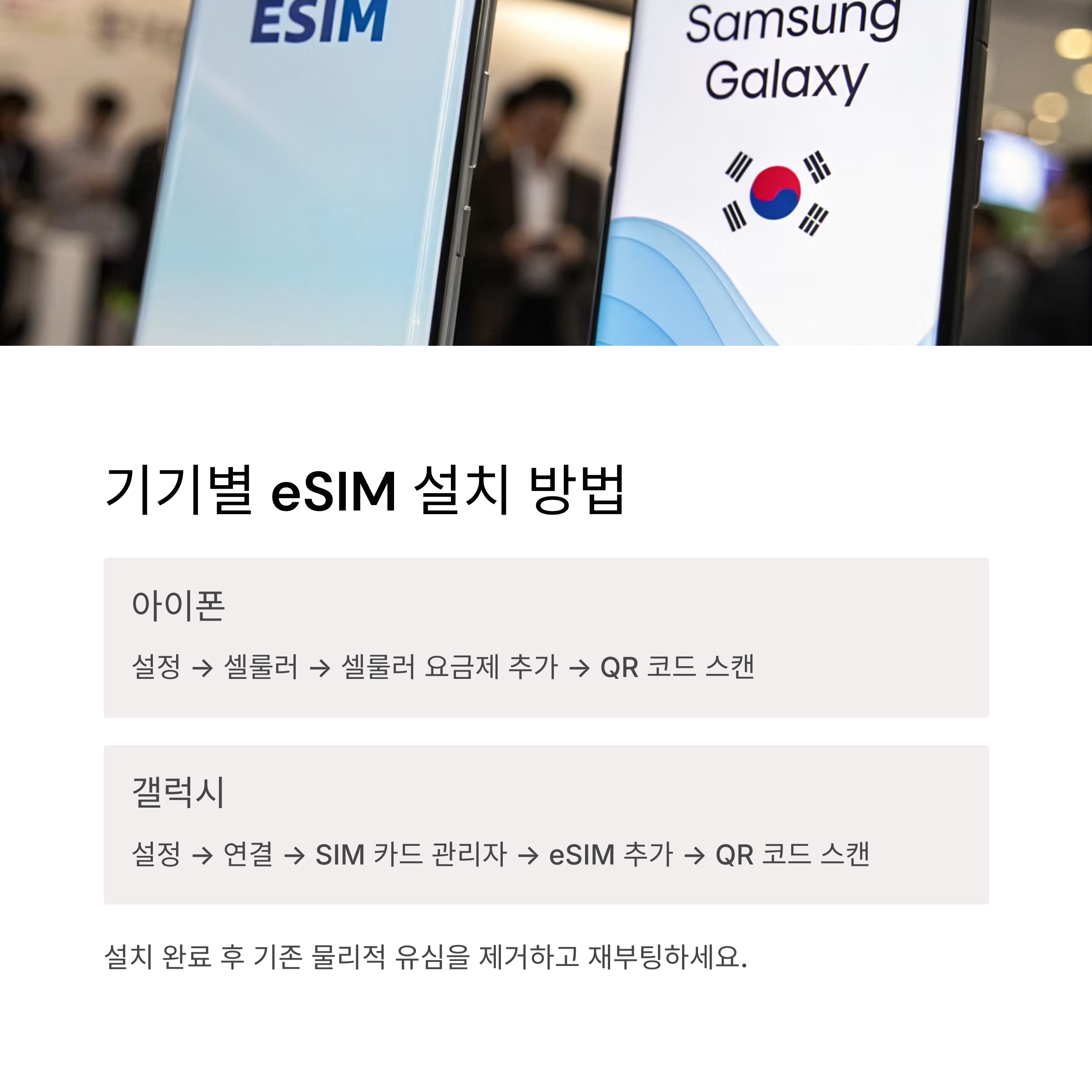 - 설정 → 연결 → SIM 카드 관리자 → eSIM 추가 → QR 코드 스캔