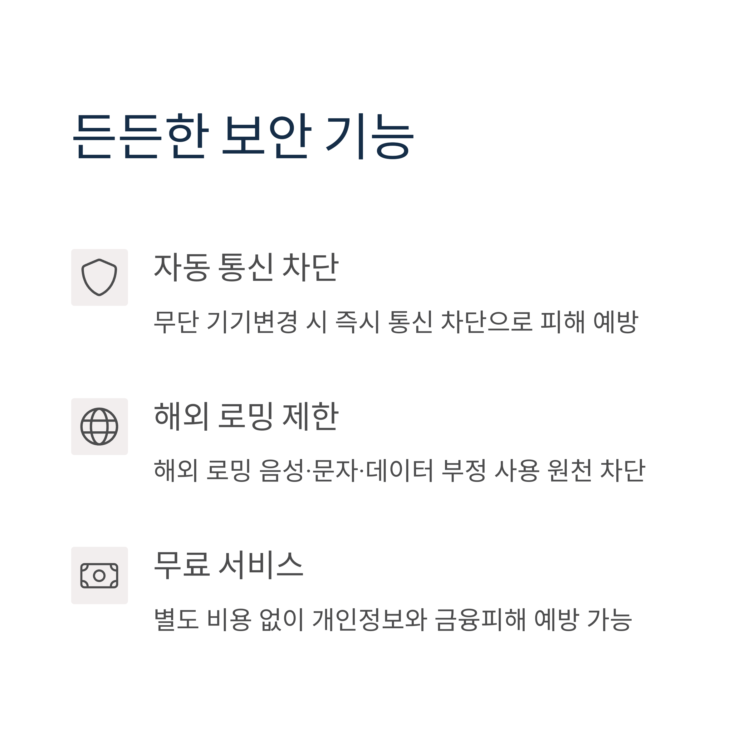 유심을 다른 기기로 이동했을 때 자동으로 통신을 차단해, 유심 복제나 심스와핑 등 보안 위협으로부터 사용자를 보호합니다.